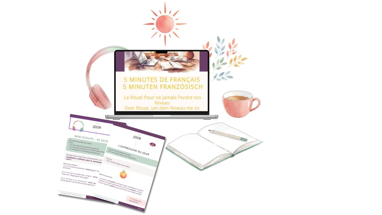 Für Erwachsene mit mindestens Niveau B1, die Französisch wieder stressfrei in ihren Alltag integrieren möchten: eine klare Mini-Routine, um in nur 5 Minuten pro Tag Fortschritte zu erzielen.